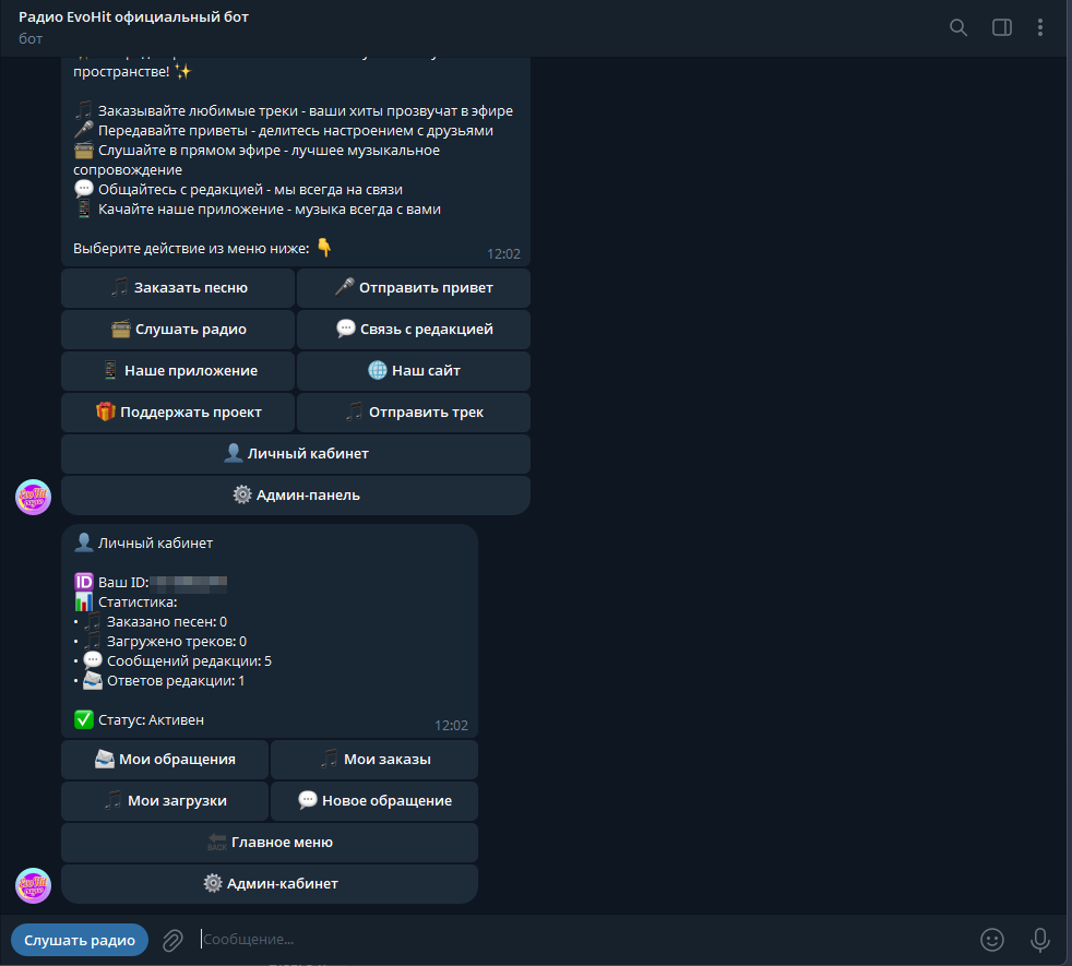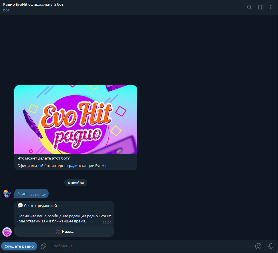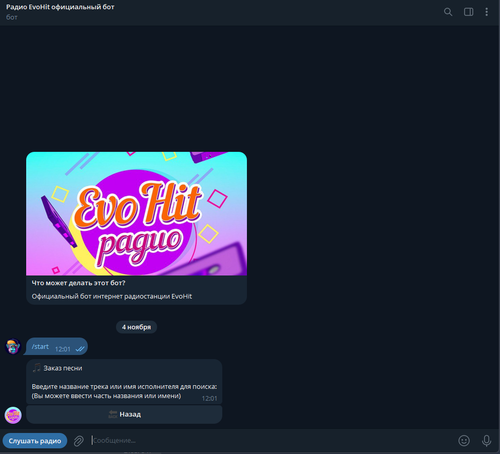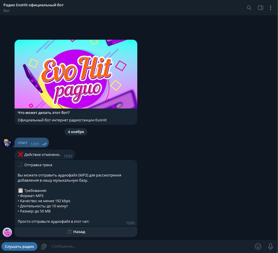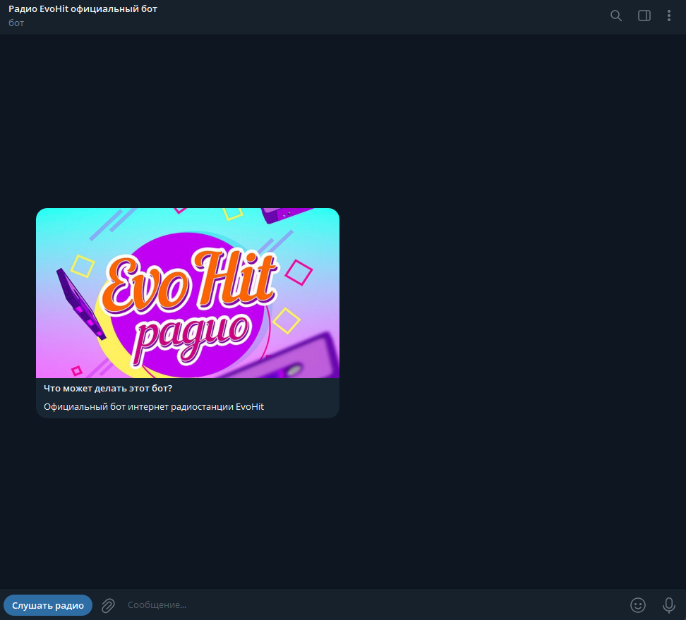 Данный Telegram-бот для радио EvoHit — это на 100% автономная виртуальная станция, которая: