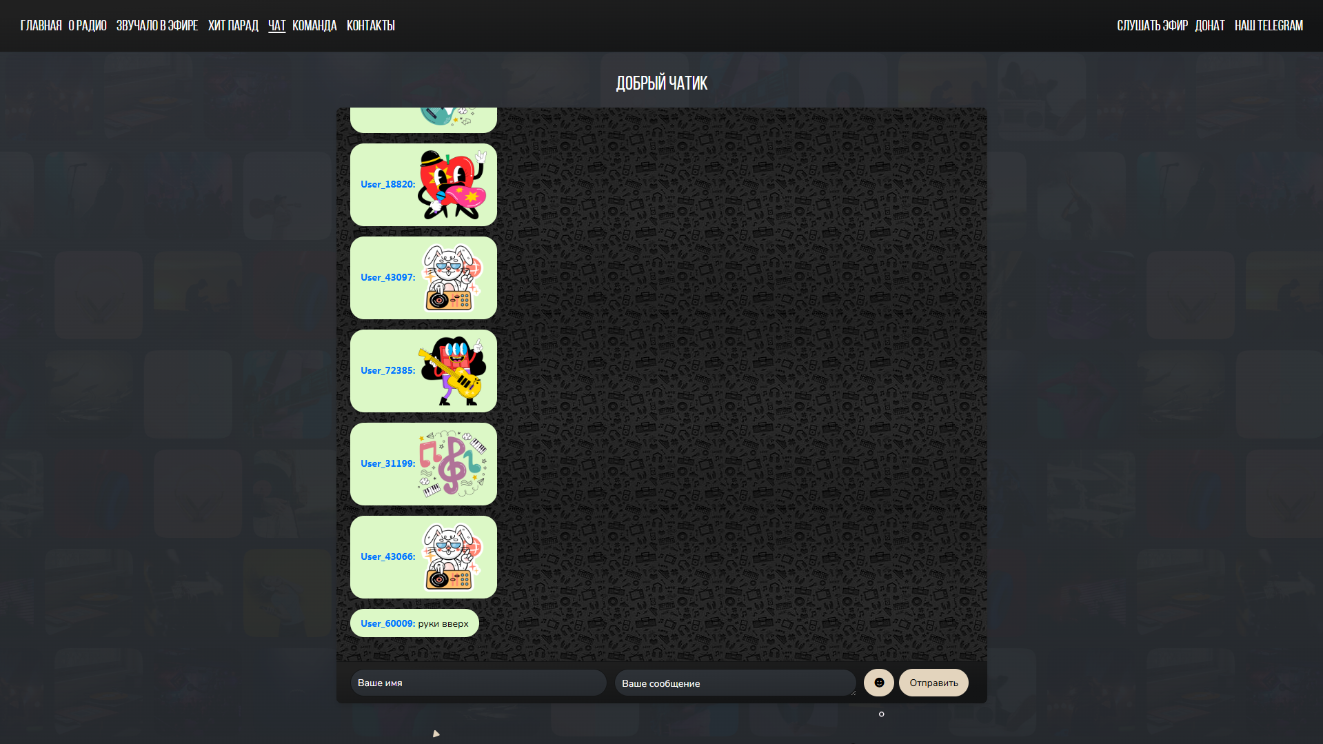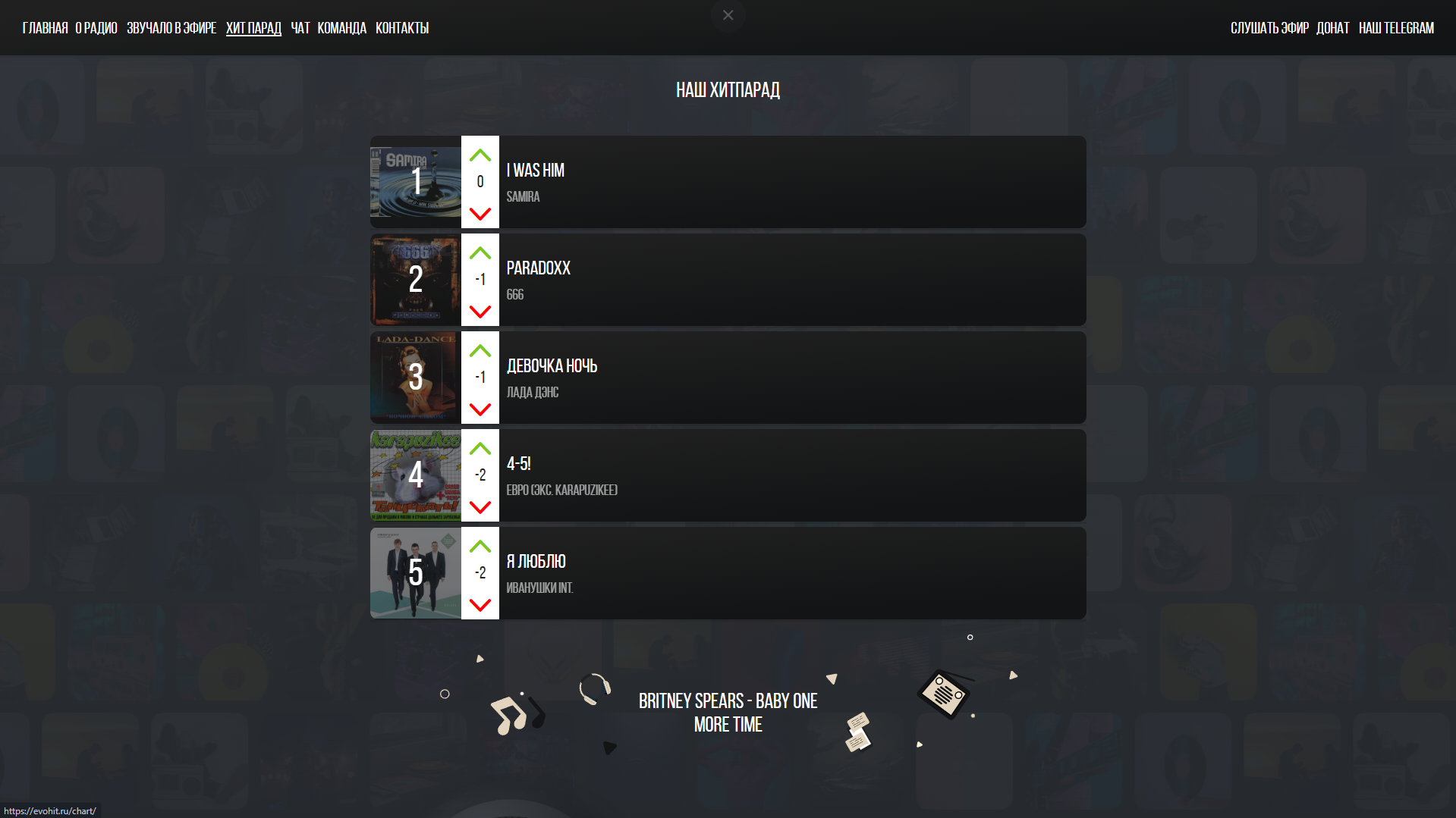 Топ-чарт: Интерактивный раздел с популярными композициями, часто с возможностью голосования.